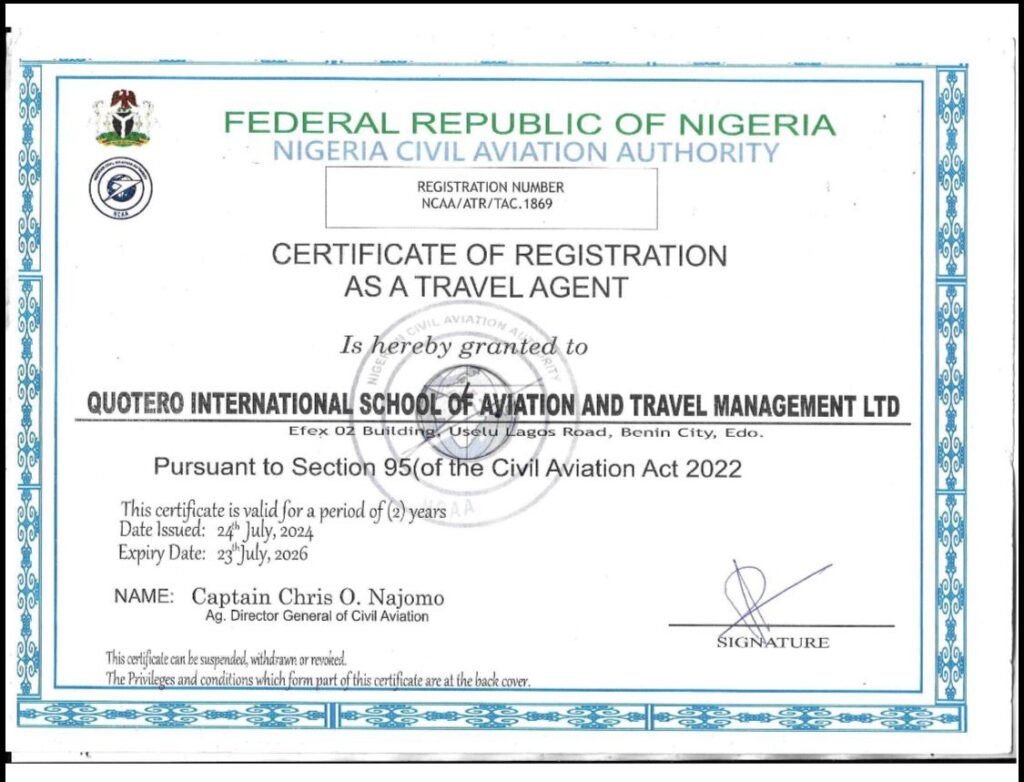 Quotero International School of Aviation and Travel Management (QISATM) was established to meet the growing demand for skilled professionals in the aviation, travel, and tourism industries. Registered with the Corporate Affairs Commission (RC No. 1976342), QISATM builds on years of industry experience as a travel and consultancy organization.